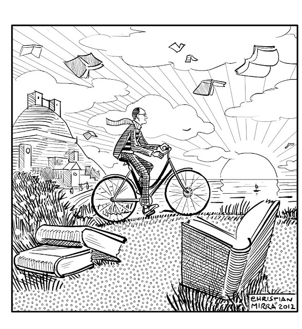 Vale la pena di soffermarsi sull’illustrazione che, a mio avviso, delinea elementi fondamentali nel vissuto di Nicola: la bicicletta, metafora della sua visione del tempo e di uno stile che, nell’“andare lento”, coglie la necessità di sottrarsi alla frenesia della contemporaneità per godere degli incontri sul cammino e per assaporare i luoghi che si attraversano; il prato fiorito, in primo piano, la sua attenzione per la natura e l’amore per la poesia; il monte alla sinistra con il monumento, forse un castello, e le case di un tipico paesaggio di paese il rispetto per le tradizioni, la storia, il passato; il mare col sole al tramonto il pensiero meridiano e il suo legame con Franco Cassano; i libri che riempiono il disegno la cultura che nutre le sue giornate. La dedica alla madre, radix/matrix, per usare le espressioni di uno dei suoi amati poeti, Paul Celan, e alla figlia Caterina, semen, testimonia il legame con due donne centrali nella sua esistenza, a cui si aggiunge un’assenza/presenza, quella della sua compagna di vita che ne rappresenta il trait d’union, la continuità tra un passato ed un futuro che si fondono nel presente.